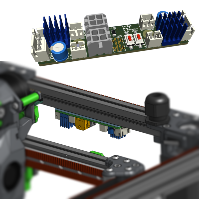 Designed and open-sourced by skuep, this is A gantry-mounted CAN stepper driver board for 15mm aluminum beams (mostly for PrintersForAnts printers). Can also be used as a USB to CAN conversion board