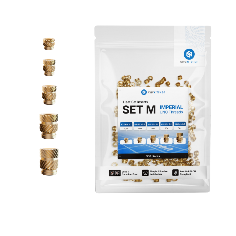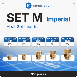 CNC Kitchen offers these premium heat set inserts machined from a lead and cadmium free brass alloy. Sold in a value pack of 350 imperial inserts from #2 to #10 sizes