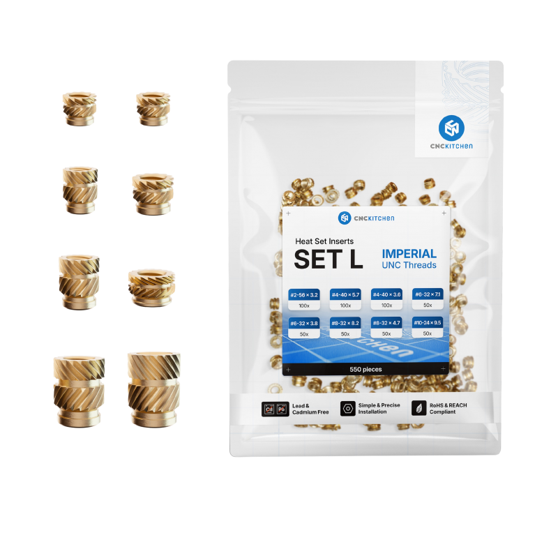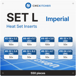 CNC Kitchen offers these premium heat set inserts machined from a lead and cadmium free brass alloy. Sold in a value pack of 550 imperial inserts from #2 to #10 sizes