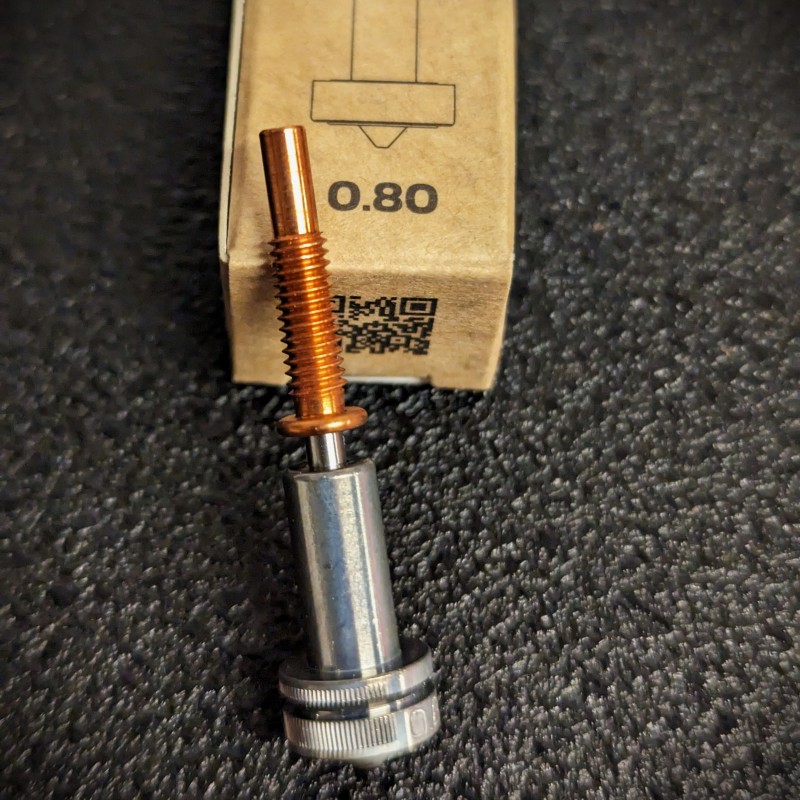Revo HT nozzles are made from a copper nozzle and copper spreader to optimise the transmission of heat. The nozzle is then coated with Chromium Nitride for additional corrosion prevention and non-stick properties for printing up to 500°C.