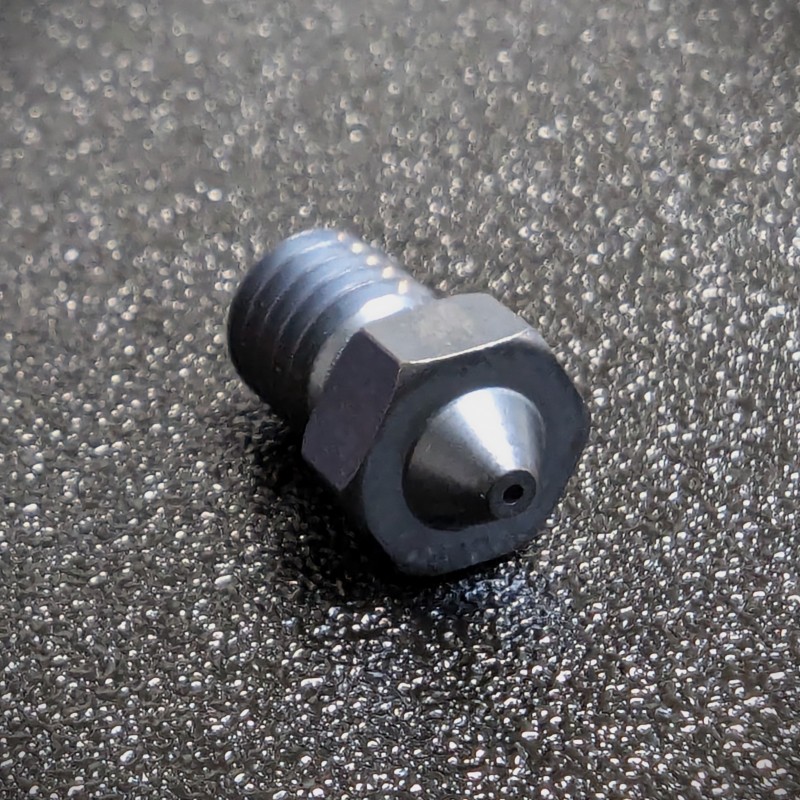 This Genuine E3D V6 "Nozzle X" is produced in a nickel plated specialized tool steel. It can withstand extremely high printing temperatures and/or abrasive filament without degradation. It also features a nano-coating that eliminates material build-up.