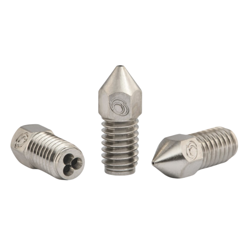 The Bondtech CHT™ nozzle splits filament into 3 thinner strands, allowing the plastic to melt the material faster and provide higher flow rates. Made of nickel coated brass.