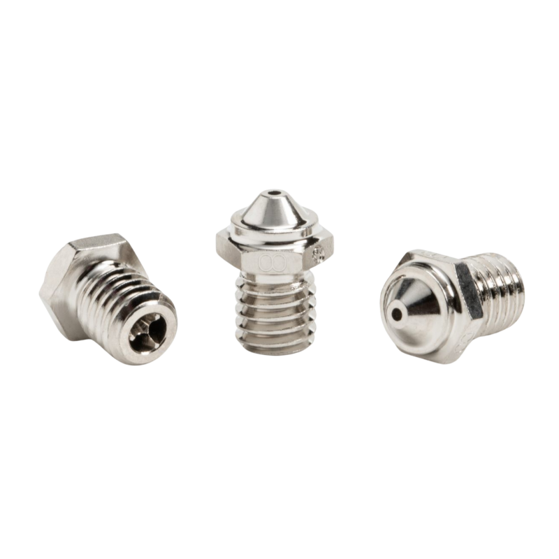 A Nickel coating is applied to our Coated Brass nozzles to provide protection against corrosion, erosion, and abrasion. Nickel coated nozzles have more corrosion resistance and lower coefficient of friction, which allows slicker feeding of material and delays plastic adhesion to the nozzle’s surface.